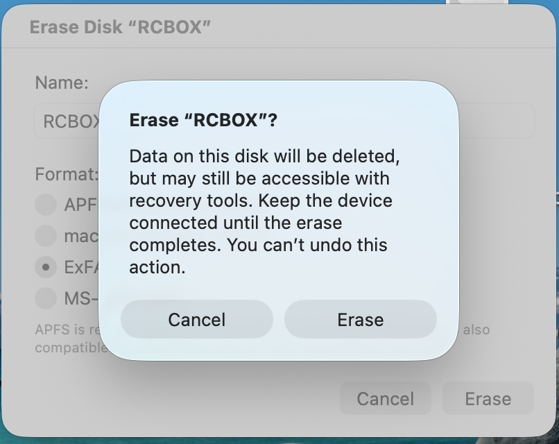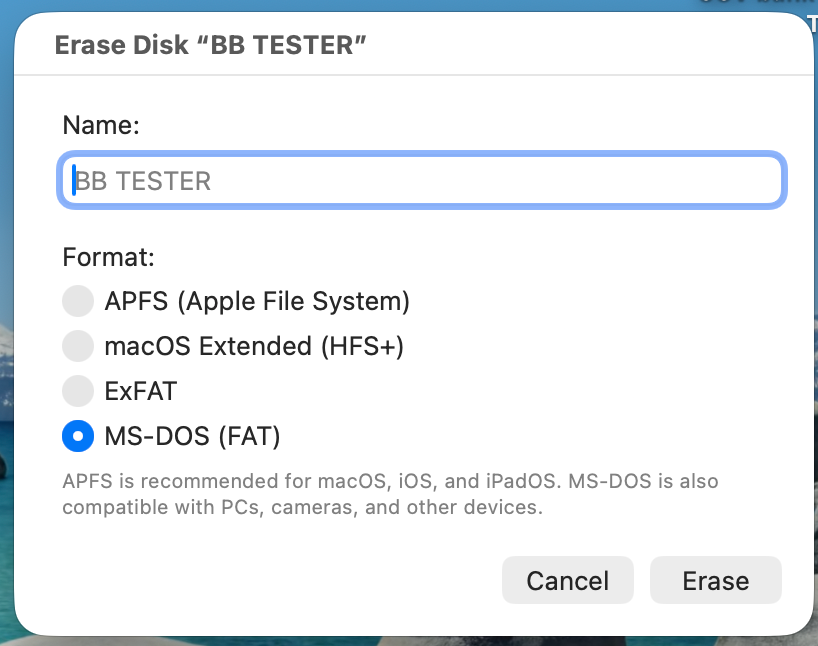 - Select the correct format, either ExFat or ExFat32 or MS-DOS (FAT)